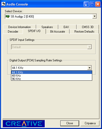 Учитывая, что Audigy2 Value была выпущена позже, чем Audigy2 ZS, а дистрибутив с обновлением драйвера одинаковый, то была надежда, что и у Audigy2 ZS можно будет активировать опорный режим в 44.1 кГц. Но, увы, эта опция не появилась ни в одной из консолей. Выбор частоты влияет лишь на SPDIF, при этом качество данных в 44.1 кГц оставляет желать лучшего.