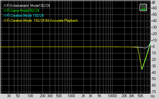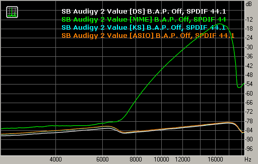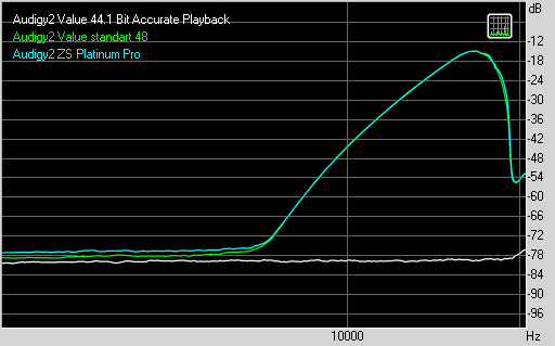 Как видно, у Audigy2 Value нет и намеков на искажения в режиме Bit Accurate Playback, сигнал передается достаточно точно, в то время как в штатном режиме на ВЧ виден высокий рост искажений. Для Audigy2 ZS Platinum Pro выбор опорной частоты для SPDIF на качество не влияет, и результаты такие же, как у Audigy2 Value в штатном режиме.