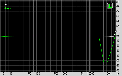 При этом в каждом из этих режимов видна работа фильтра, выраженная в спаде АЧХ на ВЧ, -6 дБ/октава, в воспроизводимой области.