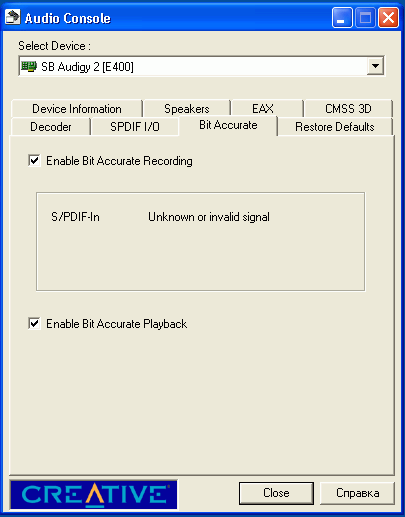При активации Bit Accurate Playback отключаются EQ, тембры НЧ и ВЧ, а также эффекты EAX накладываемые на воспроизводимый звук для 44.1 и 48 кГц.