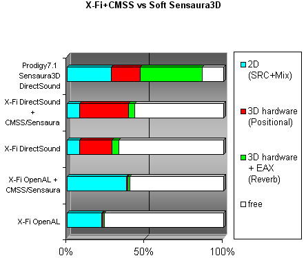 На диаграмме, полученной с PC2, голубые области отвечают за SRC и микширование каналов, красные области отвечают за позиционирование (как раз алгоритмы sensaura, добавленные в X-Fi), и зеленым показана нагрузка CPU от реверберации. На диаграмме видно, что активация CMSS привела к увеличению участка 3D hardware Positional