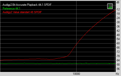 Данные на выходе SPDIF у Audigy2 ZS и Audigy2 Value автоматически преобразуются в 24 или 32 бита, поэтому тест условно 16>>32 бита. В качестве приемника использовалась профессиональная карта E-MU1212m. Для полной картины приводится замер как в штатном режиме 48, так и в режиме 44.1 Bit Accurate Playback.