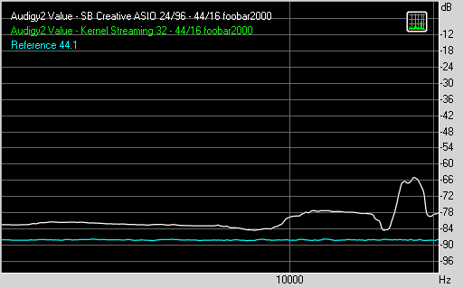 | Test | Audigy2 Value — SB Creative ASIO 24/96 — 44/16 foobar2000 | Audigy2 Value — Kernel Streaming 32 — 44/16 foobar2000 | Reference 44.1 |