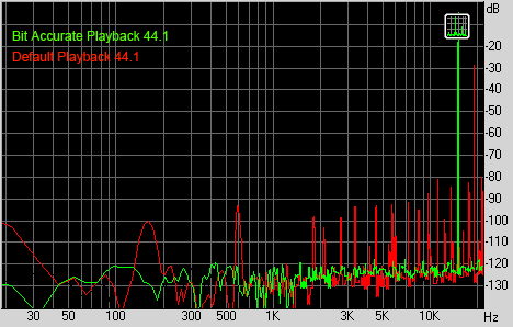 В foobar2000 v.9.2 ситуация не изменилась. Под ASIO интерфейсом те же самые искажения, в то время как под Kernel Streaming полное совпадение спектров, что можно считать великолепным результатом.
