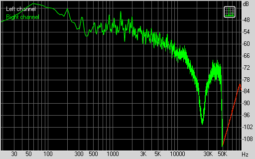 iXBT.com: Мы обнаружили на выходе карты присутствие шумов нойзшейпинга в полосе 100 кГц во всех режимах, что снижает сигнал/шум до 55 дБ и потенциально может привести к возникновению проблем в слышимой полосе при нелинейности дальнейшего тракта.