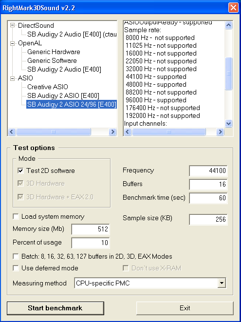 Режим SB Audigy 2 ASIO 24/96 имеет поддержку трех частот 44.1, 48 и 96 кГц, а также позволяет выводить данные в 16, 24 и 32 бита.