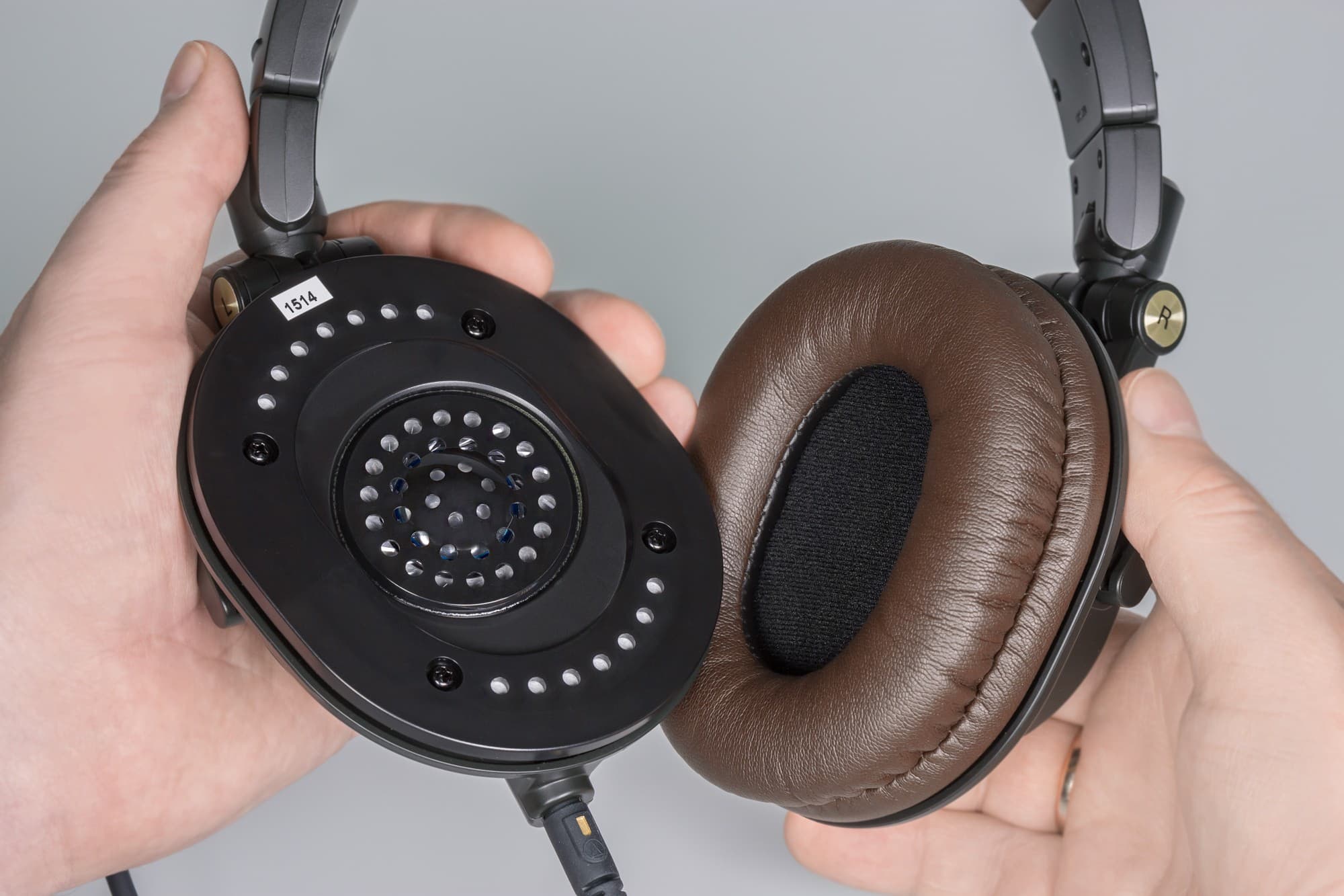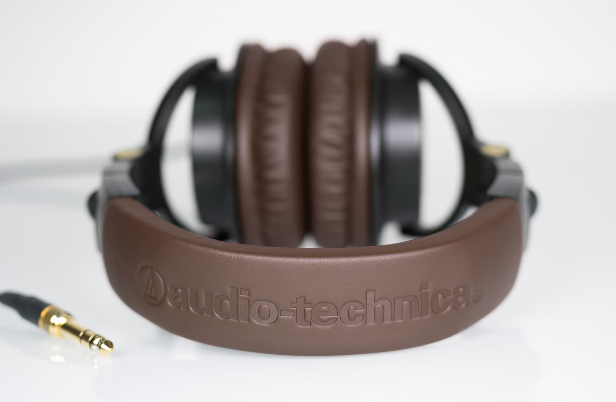 Нам на тестирование попал вариант ATH-M50xDG (темно-зеленый). Однако зеленый в данном случае настолько темный, что он вообще неотличим от черного, см. фотографию. Главная же особенность модели — это темно-коричневый цвет оголовья и амбушюр. Интернет подсказывает, что цвет металлических вставок на чашках называется honey gold. Есть еще один вариант ограниченной партии, M50xBL, синий с кричащей светло-коричневой кожей. Обычные серийные варианты — полностью черный M50x и полностью белый M50xWH. Наушники из ограниченной партии стоят чуть дороже обычных. Разница, впрочем, несущественная.