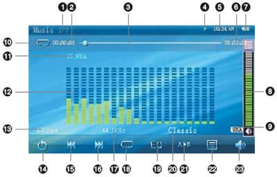 Управлять плеером очень удобно, благодаря тому, что нас не ограничивает «количество кнопок»: сколько надо, столько можно и «нарисовать». В руководстве пользователя имеется хорошая и подробная схема раскладки дисплея, так что мы приведем ее тут: