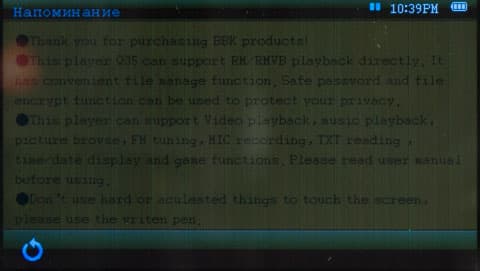К организации файлов претензий нет: поиск нужного осуществляется через базу. Доступны следующие варианты просмотра последней: все файлы, плейлисты (их может быть до пяти, каждый до 100 файлов, создаются и настраиваются прямо на плеере), исполнитель, альбом или жанр. Присутствует и возможность поиска трека, но, к сожалению, только на английском языке. Может расстроить, разве что, отсутствие «обычной» навигации по папкам и файлам, но ее можно осуществить при помощи встроенного файлового менеджера. Правда, все файлы в таком режиме воспроизвести не удастся — если плеер открывать нажатием на файл в менеджере, он работает только с текущей папкой. Впрочем, для аудиокниг такой режим, как правило, вполне достаточен. Минусом будет только невозможность создания закладок в аудиофайлов. Точнее, две автоматически создаваемые закладки есть — создаются при выходе из плеера в процессе воспроизведения и доступны в меню «Возобн.», (туда попадают и аналогичным образом две закладки на видеофайлы, и две для текстов), но при запуске воспроизведения из файлового менеджера «посмертные» закладки не создаются.