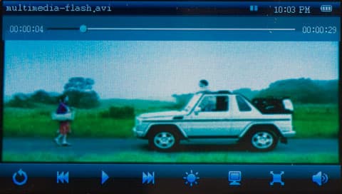 Возможности плеера в режиме работы с видео просты, но достаточны. Аналогично аудио, поддерживается ускоренное воспроизведение вперед и назад и позиционирование в любое место ролика. «Нормальных» закладок нет, но при выходе позиция в файле сохраняется в специальном списке, причем в двух файлах, просмотренных последними. Во время просмотра можно быстро подстроить яркость дисплея, отношение сторон выбрать (4:3 или 16:9) и одним нажатием виртуальной кнопки «отправить» изображение на видеовыход.