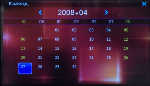 В плеере имеются часы реального времени, с которыми связаны еще несколько приложений. Во-первых, собственно часы, удобные своим отображением и в процессе воспроизведения музыки, видео, текстов и картинок. Во-вторых, календарь. Простой — без списка задач, но последний в плеере и не требуется. Но быстро посмотреть, на какой день недели выпадает какая-то дата — иногда нужно.