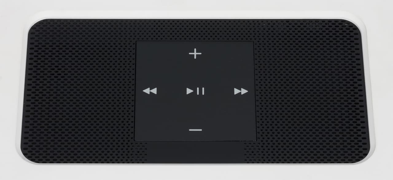 На верхней панели присутствует вставка темного цвета, в центре которой есть глянцевая панель с пятью кнопками управления воспроизведением и громкостью, оборудованными подсветкой, а слева и справа от нее расположены решетки пассивной вентиляции.