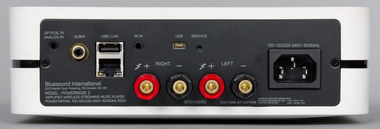 В PowerNode 2 установлен усилитель HybridDigital на два канала 60 Вт на 8 Ом. Для него заявлено SNR 110 дБ и THD+N 0,020%. Сетевое подключение реализуется через гигабитный порт или Wi-Fi 802.11b/g/n 2,4 ГГц, до 150 Мбит/с. Также здесь присутствует адаптер Bluetooth с поддержкой aptX.