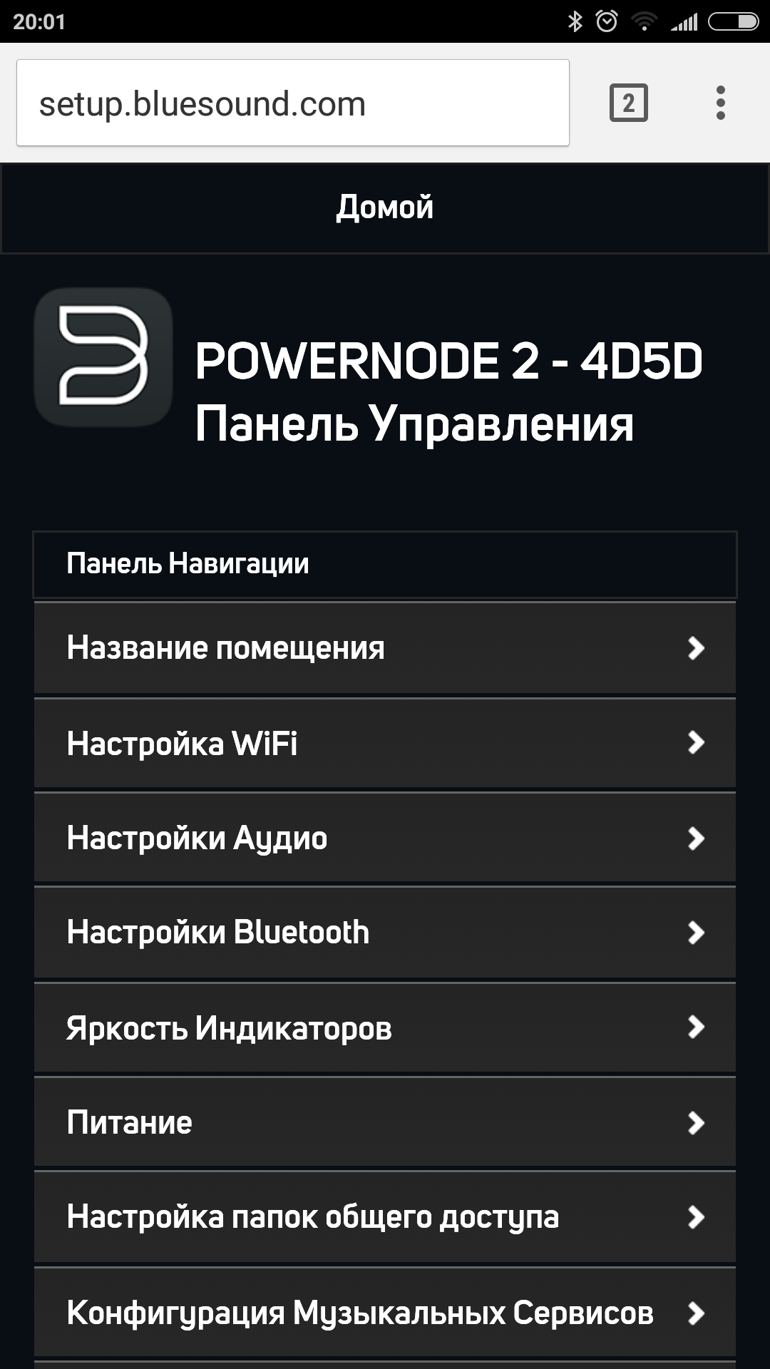 Подключение не вызывает никаких сложностей. Кроме подключения аудиокабелей, требуется только подать питание. Основная настройка, которая требуется для работы устройств, — подключение к локальной сети. Лучше всего использовать проводное соединение, которое гарантирует стабильную скорость и отсутствие потерь. Для этого достаточно подключить кабель от роутера в соответствующий порт устройства. Если такой возможности нет, можно воспользоваться встроенным беспроводным адаптером. К сожалению, он поддерживает только диапазон 2,4 ГГц, который сегодня в городских условиях часто очень плотно занят. Процесс подключения в этом случае немного сложнее: сначала вы соединяетесь с открытой сетью, которую создает само устройство, потом открываете в браузере ПК или смартфона/планшета сайт setup.bluesound.com и попадаете в собственный веб-интерфейс настройки.