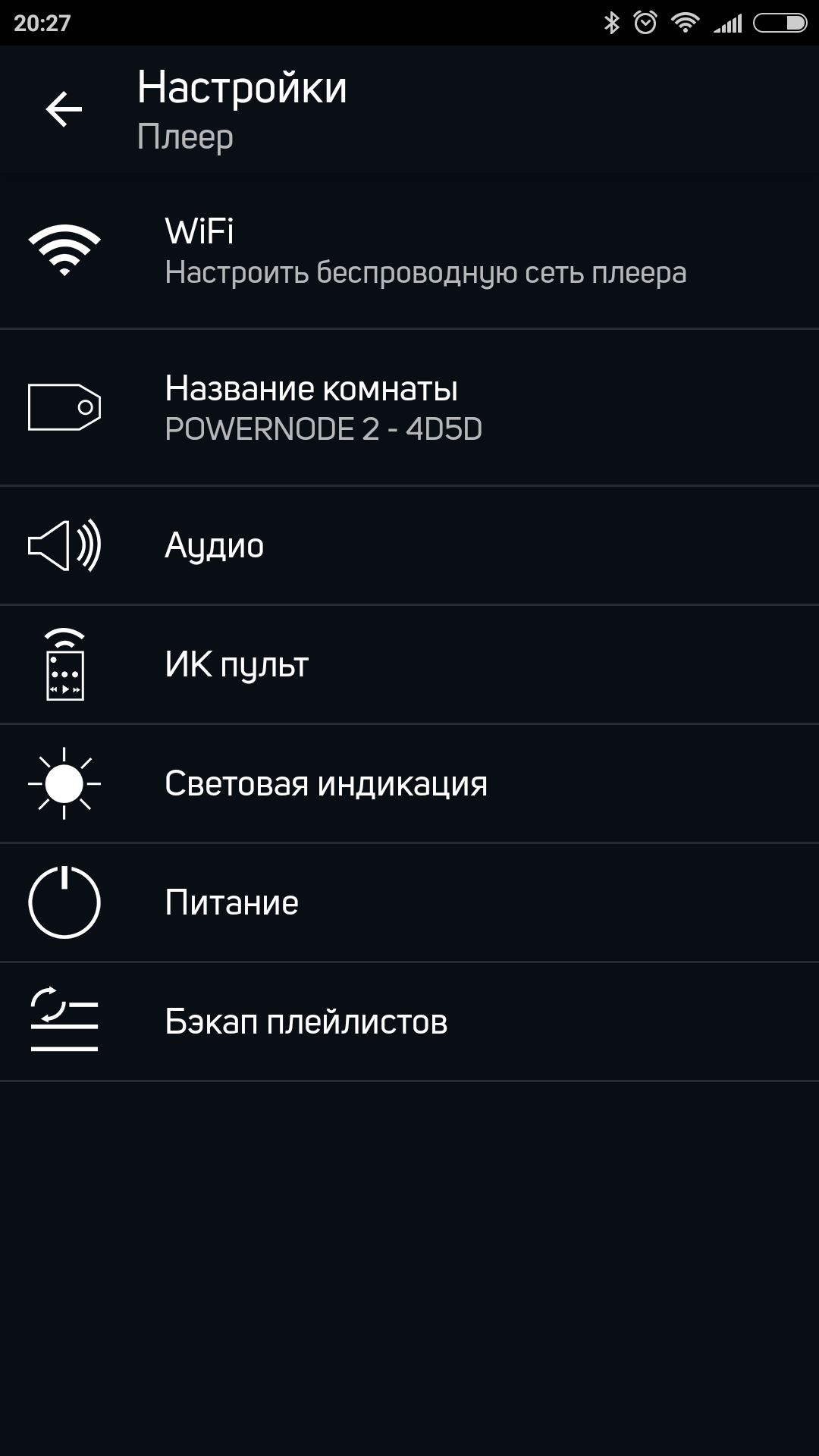 Список доступных через программу настроек включает в себя: параметры беспроводной сети (при наличии адаптера), изменение имени, настройки звука (здесь, в частности, можно включить использование сабвуфера (разделение на 80 Гц) и организовать стереорежим на двух устройствах в группе), обучение командам ИК-пульта (включая управление воспроизведением и громкостью), выбор яркости индикатора.