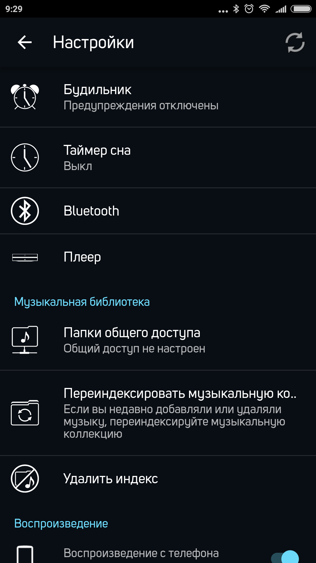 Кроме индивидуальных настроек плееров, есть и несколько общих для всей системы параметров — в частности, настройка будильников и таймера сна. Более интересны пункты работы с медиабиблиотекой. Кроме хранения данных на диске Vault 2, есть возможность подключения удаленных сетевых ресурсов.