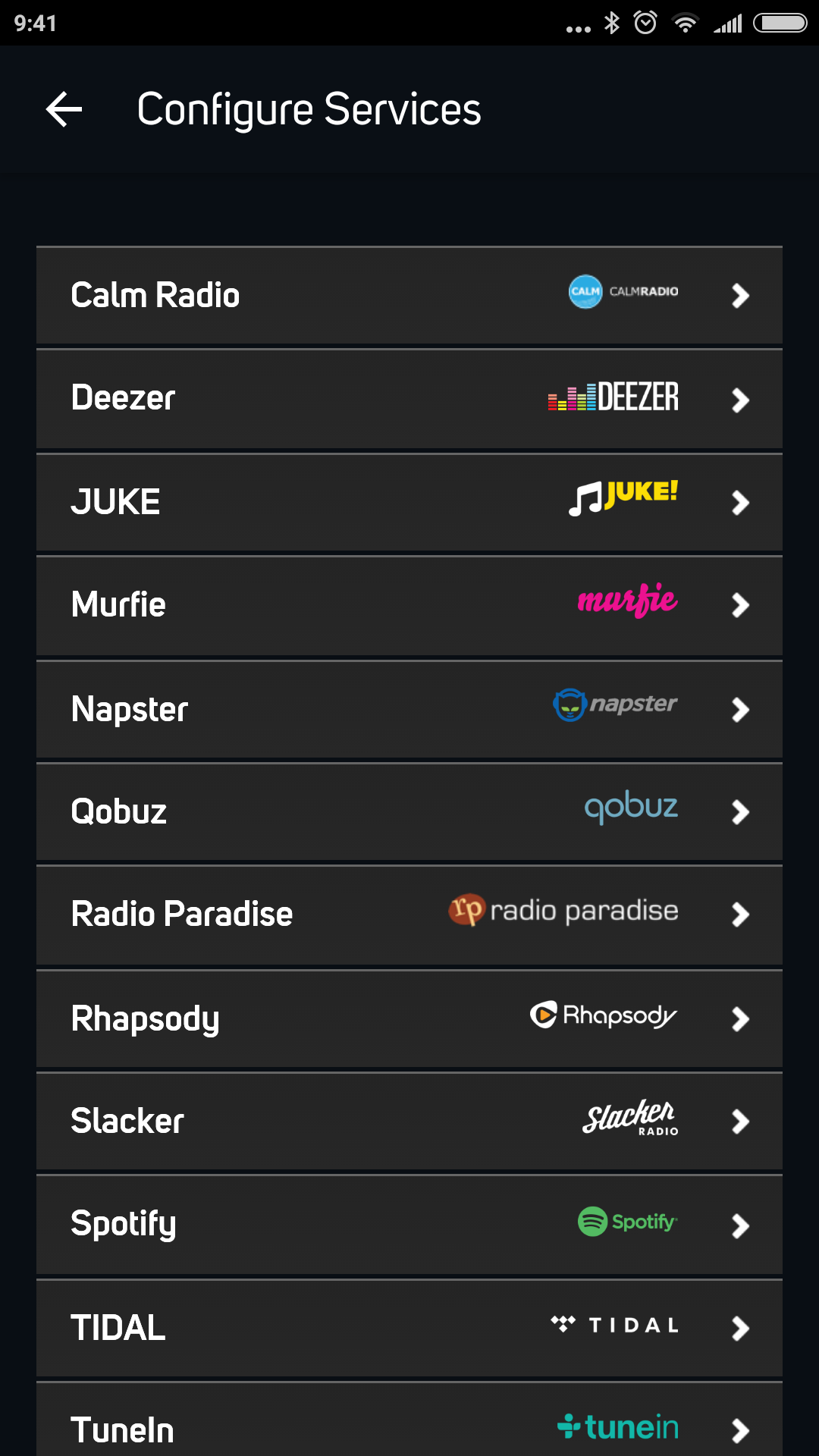 Список онлайн-сервисов у данной системы достаточно велик и на момент подготовки статьи включал в себя радио Calm Radio, iHeartRadio, Radio Paradise, Slacker Radio и TuneIn, музыкальные сервисы Deezer, Juke, Murfie, Napster, Qobuz, Rhapsody, Spotify, Tidal, Wimp. Для большинства из них потребуются премиум-аккаунты. Кроме того, могут иметься региональные ограничения для работы с ними. Для поклонников Hi-Res предусмотрена возможность скачивания на Vault 2 купленных записей из сервисов HDtracks и HighresAudio.