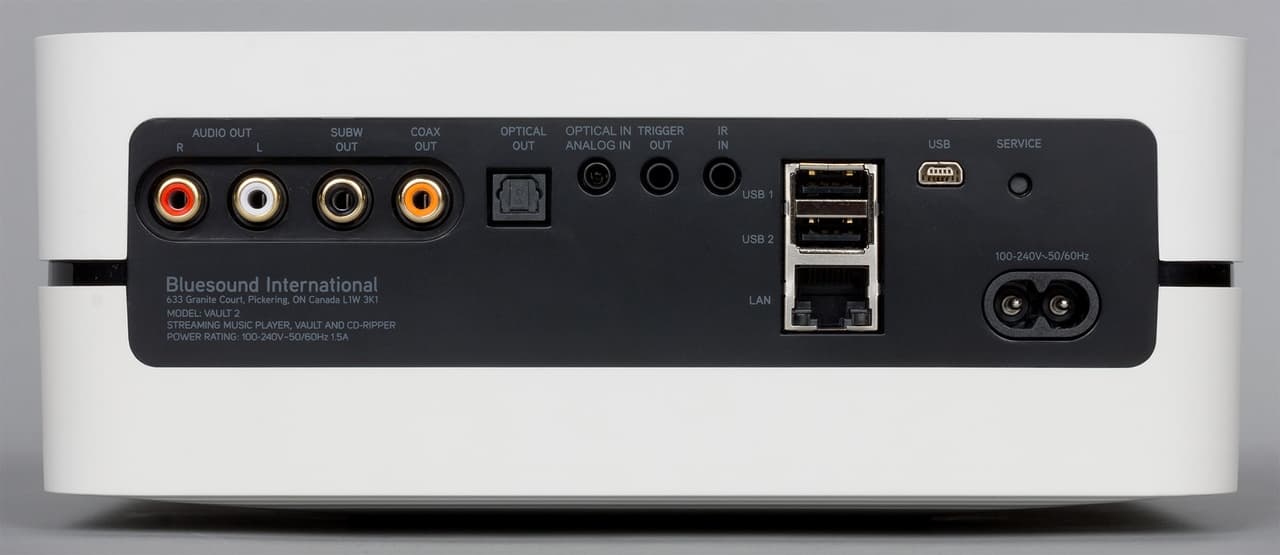 На задней панели находятся: вход кабеля питания, скрытая кнопка и порт Mini-USB для сервисного обслуживания, аналоговый стереовыход (два RCA), выход на активный сабвуфер, коаксиальный и оптический цифровые выходы, аналоговый вход (миниджек 3,5 мм), совмещенный с цифровым оптическим входом, выход для управления внешней аппаратурой, вход ИК-приемника, два порта USB 2.0, гигабитный сетевой порт со встроенными индикаторами.