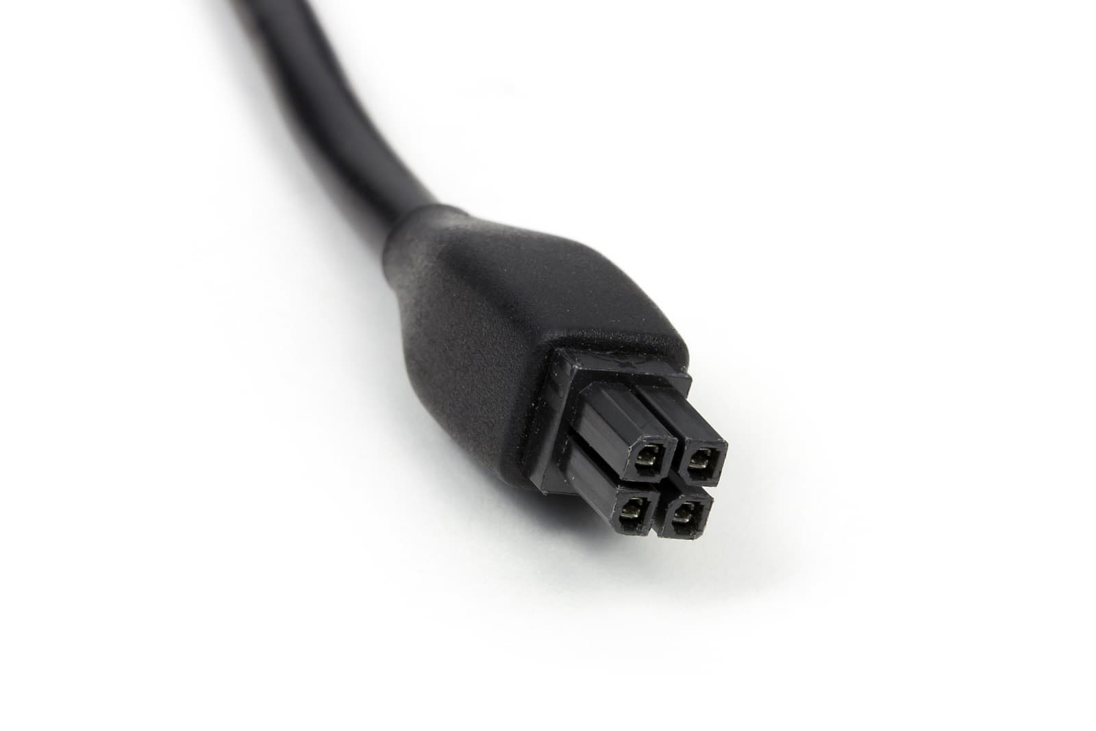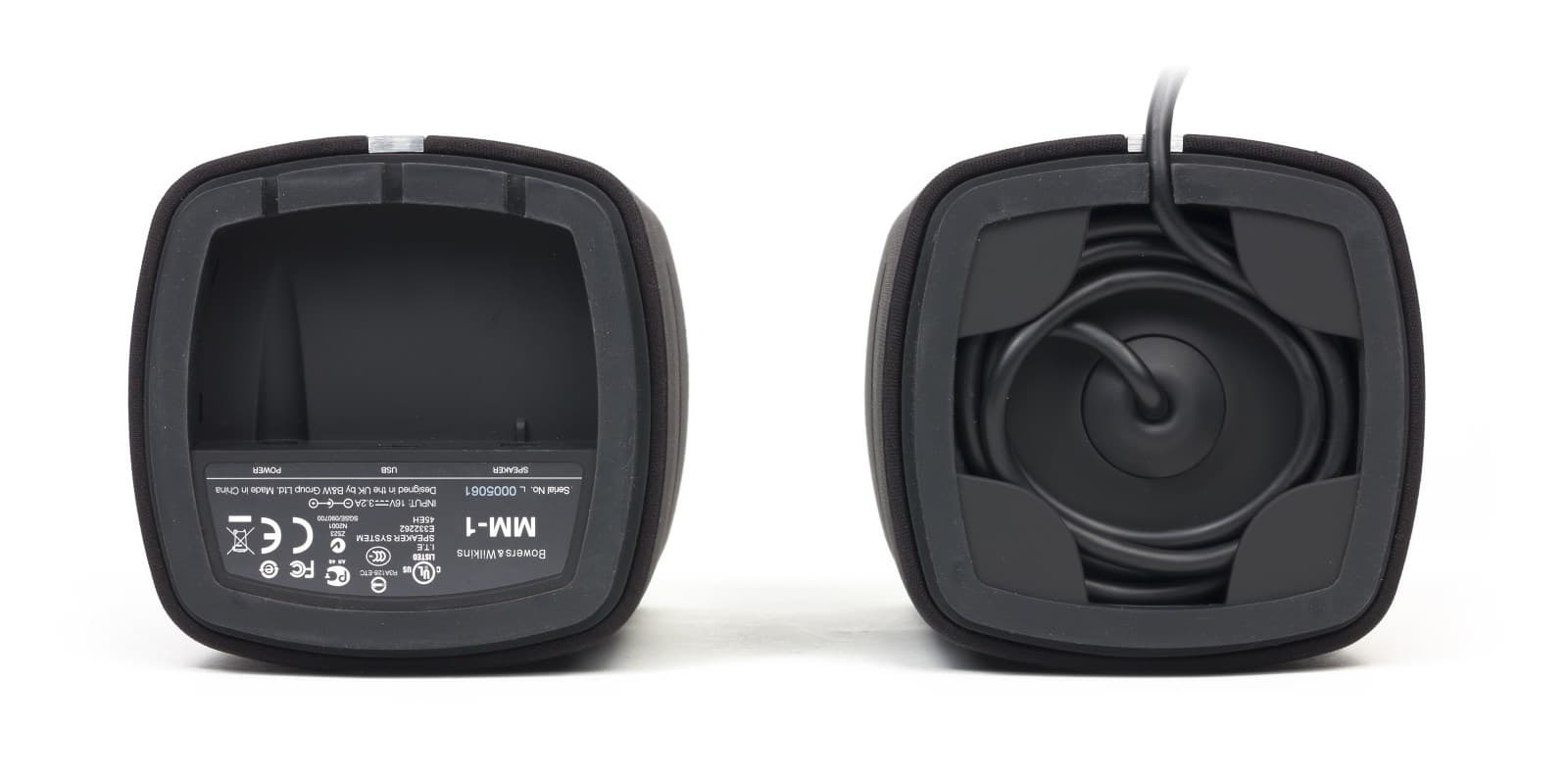 Внутри полых силиконовых оснований подключаются необходимые кабели. Шнур динамика-сателлита несъемный, но его длину можно подстроить, скрутив лишнюю часть кабеля в основании. Рассчитанный на использование в тесном компьютерном окружении, он имеет длину около метра. Если динамики необходимо разнести дальше, можно приобрести дополнительный метровый удлинитель B&W.