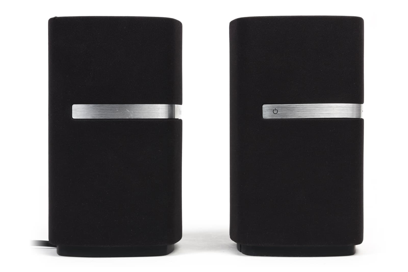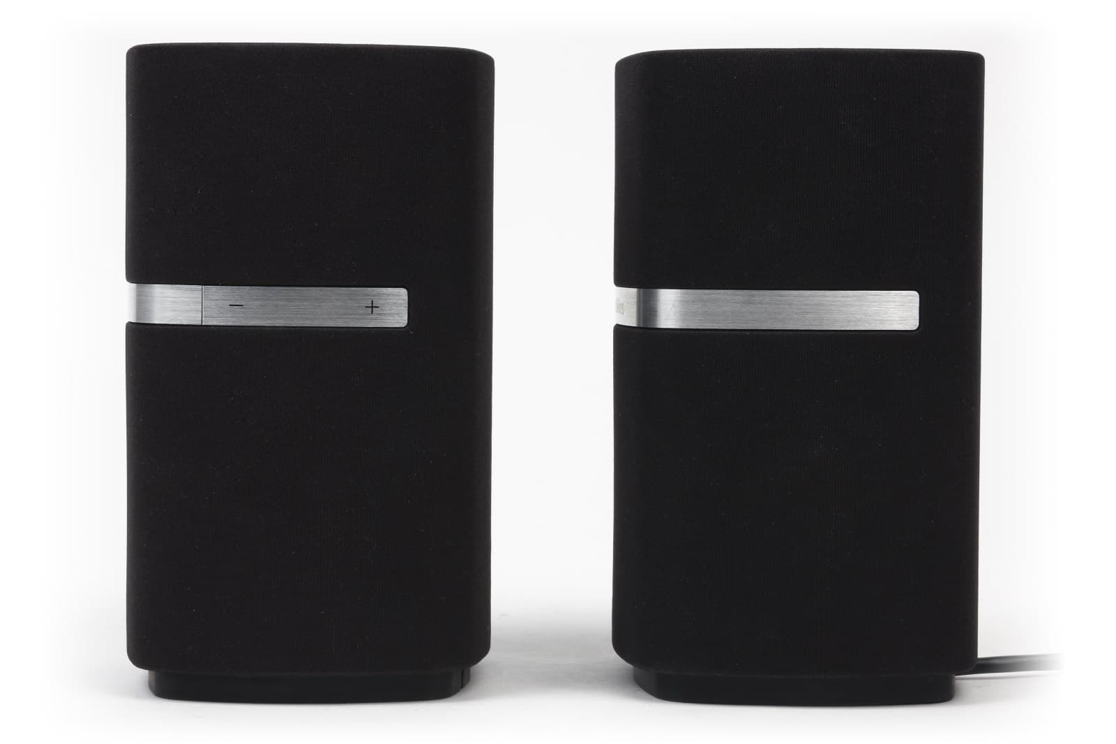 «Башенки» MM-1 имеют форму, стандартную для компьютерных колонок. Черный корпус спереди и сбоку пересекает серебристая полоска. Спереди на ней размещен логотип производителя. Маленькая точка на правом динамике — это яркий светодиод, который горит синим в активном, а красным — в standby-режиме.