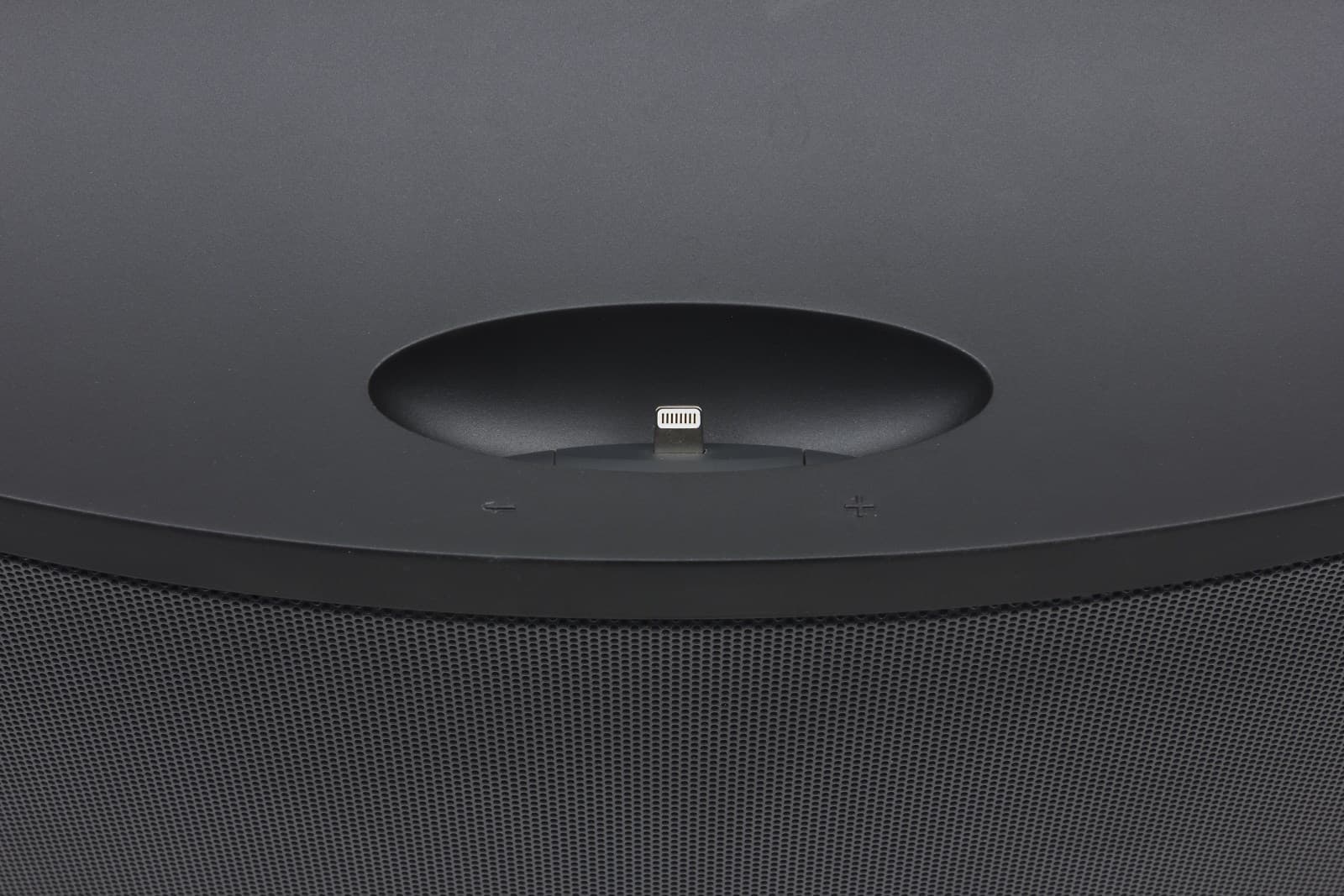 Пластиковые части аудиосистемы имеют покрытие софт-тач, следов от пальцев на котором почти не остается. По центру корпуса расположена, собственно, сама док-станция. «Папа» Lightning установлен так, что допускает небольшой люфт по вертикали. Углубление, в котором он размещен, может вместить лишь iPhone или iPod — для планшета места уже не хватит. Это, конечно же, сильно ограничивает функциональность устройства, ведь в домашних условиях, на которые рассчитана аудиосистема, куда приятней использовать iPad.