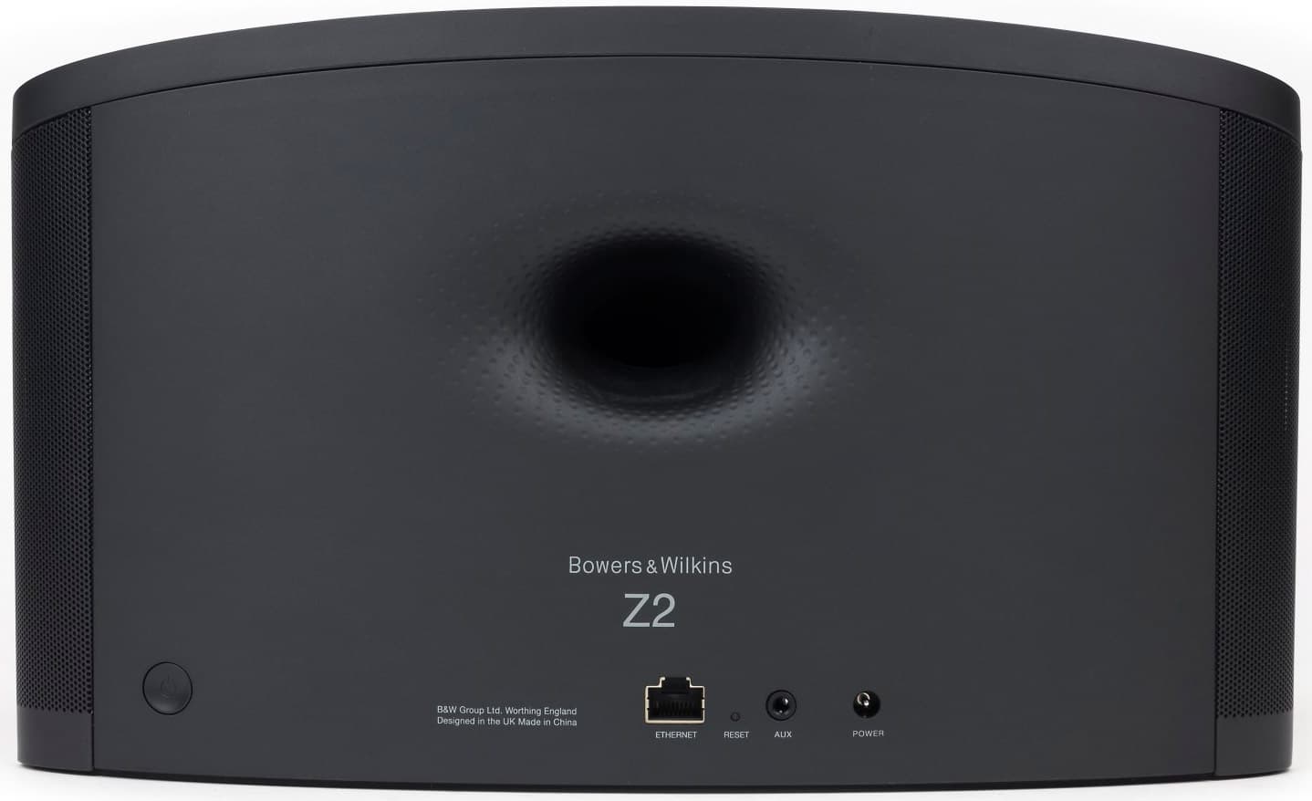 По центру задней стенки размещено отверстие фазоинвертора, выполненного по фирменной технологии Flowport — то есть с углублениями на манер шарика для гольфа. Внизу — разъем Ethernet, кнопка для перезагрузки, линейный вход и гнездо сетевого адаптера. В стороне у решетки находится кнопка включения, с помощью которой также можно переключать источники звука (линейный вход — док-станция — Airplay). Учитывая, что эти разъемы вряд ли будут часто использоваться в домашних условиях, их размещение сзади выглядит оправданным решением.
