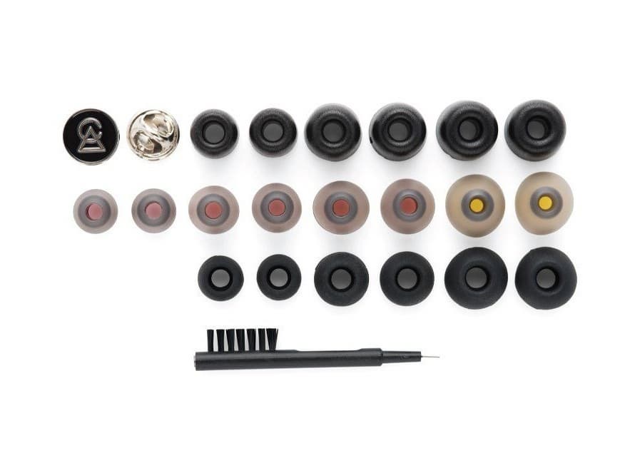 Наушники богато укомплектованы сменными насадками. Есть и стандартные силиконовые (S/M/L), и розовые SpinFit (XS/S/M/L), и насадки из микропористого материала (S/M/L). Щеточка позволяет содержать наушники и насадки в чистоте. В комплекте также идет металлический значок-булавка с логотипом производителя на одежду.