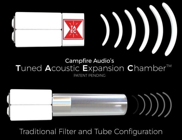 Но главная гордость разработчика в конструкции — это акустическая камера TAEC. Камера сложной формы изготавливается на 3D-принтере и имеет ряд преимуществ по сравнению со стандартными канальными трубками, применяемыми в наушниках прочих производителей. Камера убирает геометрические резонансы и дает более равномерный звук на ВЧ.