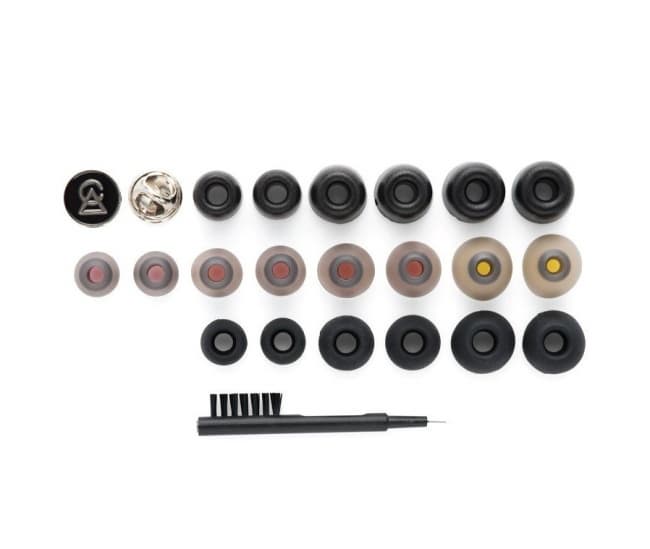Комплект сменных насадок Andromeda полностью повторяет комплект наушников Vega: стандартные силиконовые (S/M/L), розовые SpinFit (XS/S/M/L) и насадки из микропористого материала (S/M/L). Щеточка позволяет содержать наушники и насадки в чистоте. В комплекте также идет металлический значок-булавка с логотипом производителя на одежду.