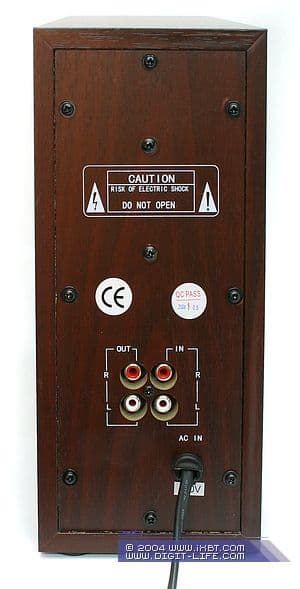 Акустическое оформление саба — схема с фазоинвертором. Отверстие ФИ выведено вперед, а диффузор динамика — на боковую панель. Диаметр диффузора составляет 9 сантиметров. На задней панели сабвуфера расположены разъемы для подключения колонок и линейный вход. Длина комплектного провода "миниджек на стерео RCA" составляет 1,5 метра.