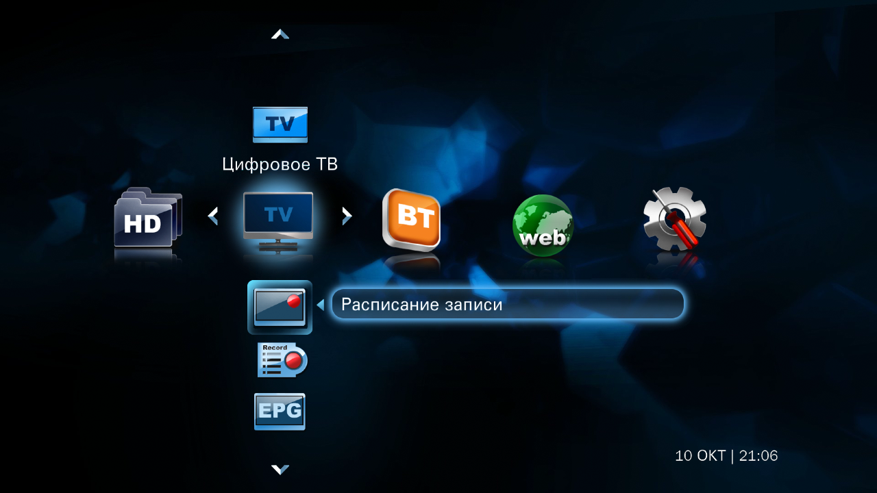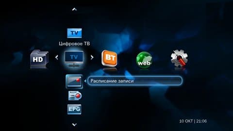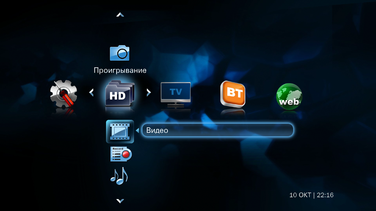Собственно за работу с медиафайлами отвечает пункт «HD» в главном меню. По вертикали в нем расположены иконки выбора видео, аудио, фото, записей тюнера. Можно воспользоваться и выделенными кнопками на пульте, для перехода на эти пункты.