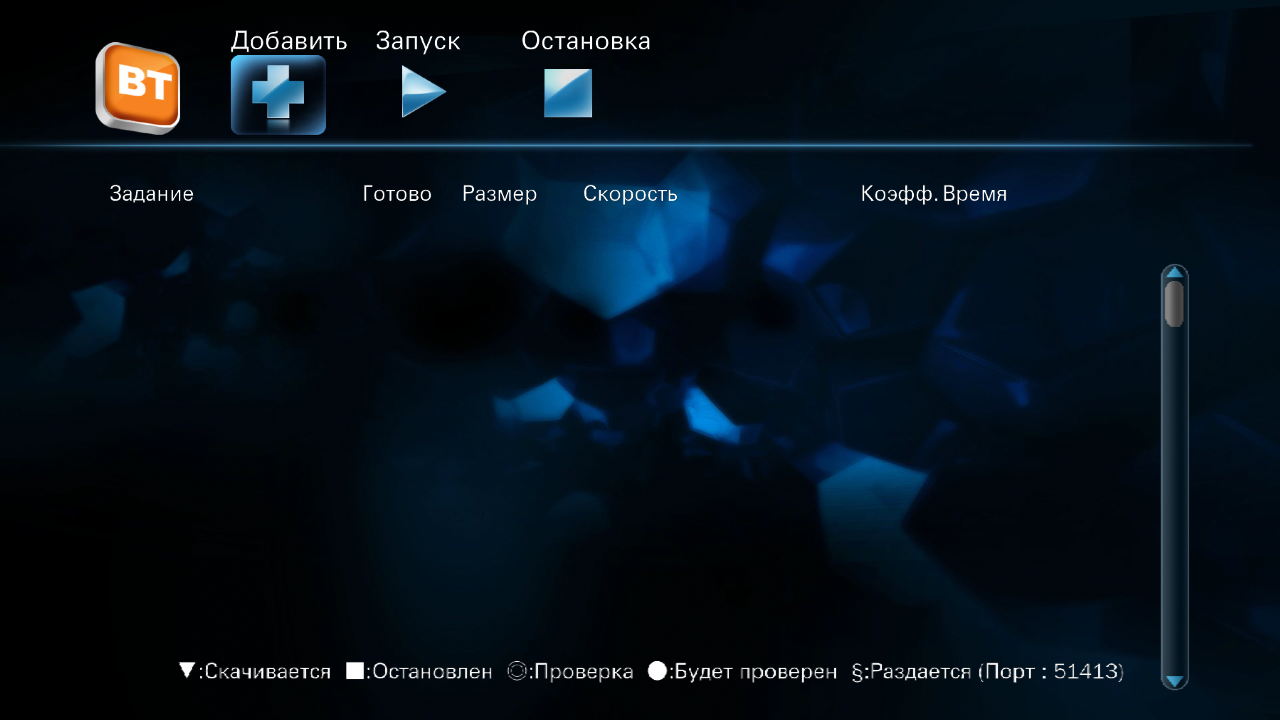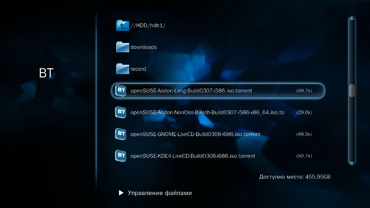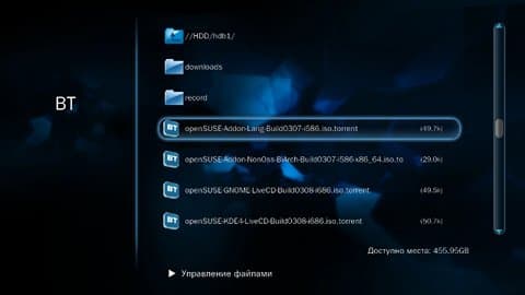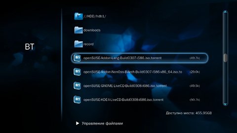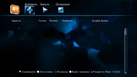 Вторая, интересная многим, функция — автономная загрузка файлов по протоколу BitTorrent. Работать с заданиями можно прямо с пульта дистанционного управления. В том числе и ставить новые на загрузку, открывая файлы формата .torrent со встроенного диска, USB-накопителей или по сети.