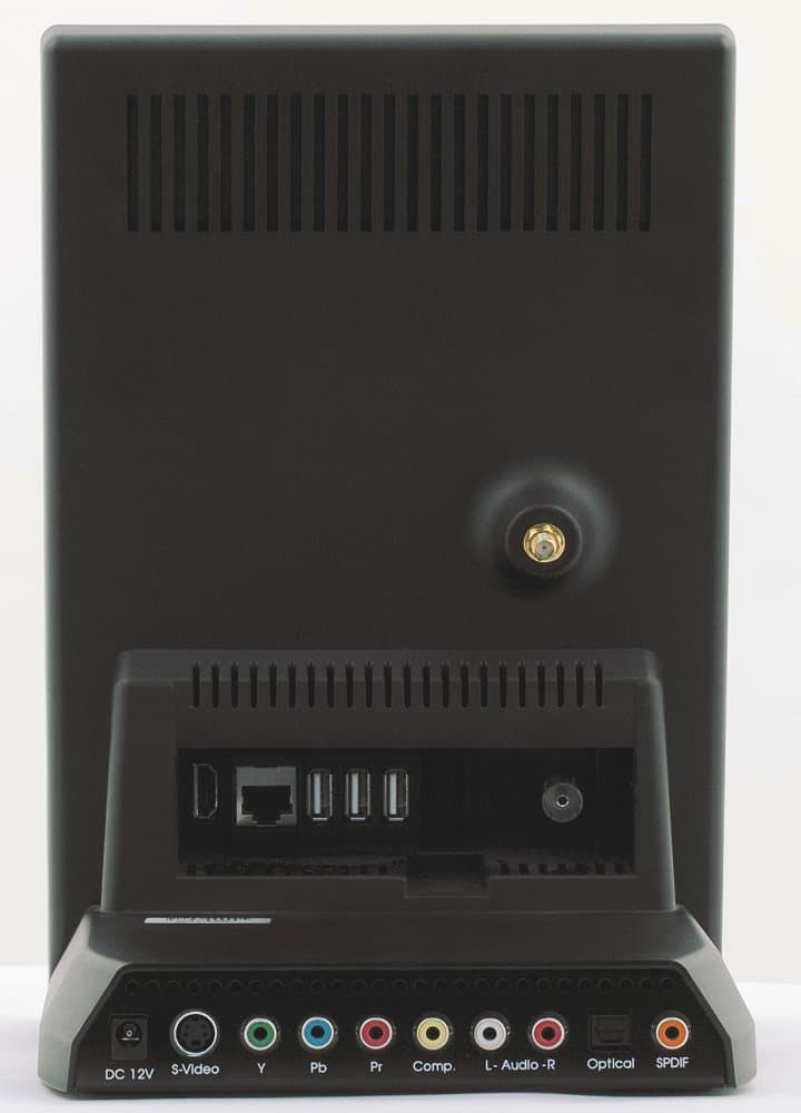 На торце подставки находятся аналоговые подключения звука и видео — стерео аудио, композитное видео и S-Video, компонентное видео, цифровой звук (коаксиальный и оптический). В целом набор более чем достаточный. Обратим внимание только на отсутствие возможности доступа к установленному в плеер винчестеру кроме как по сети. Так что если диск емкий, то записывать на него библиотеку придется долго, поскольку скорость не очень большая.