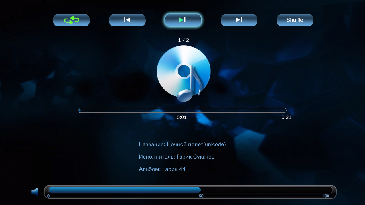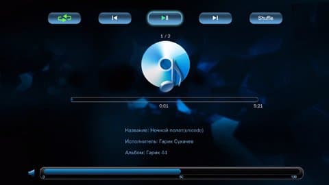 Со звуком несколько веселее — MP3, WMA, AAC, WAV. Теги читаются только в MP3, русские — только в CP1251. Изображение обложки альбома для показа по время музыки плеер берет из файла в той же директории, где лежат аудиофайлы. Во время прослушивания музыки работает перемотка в обе стороны и можно менять порядок воспроизведения файлов.