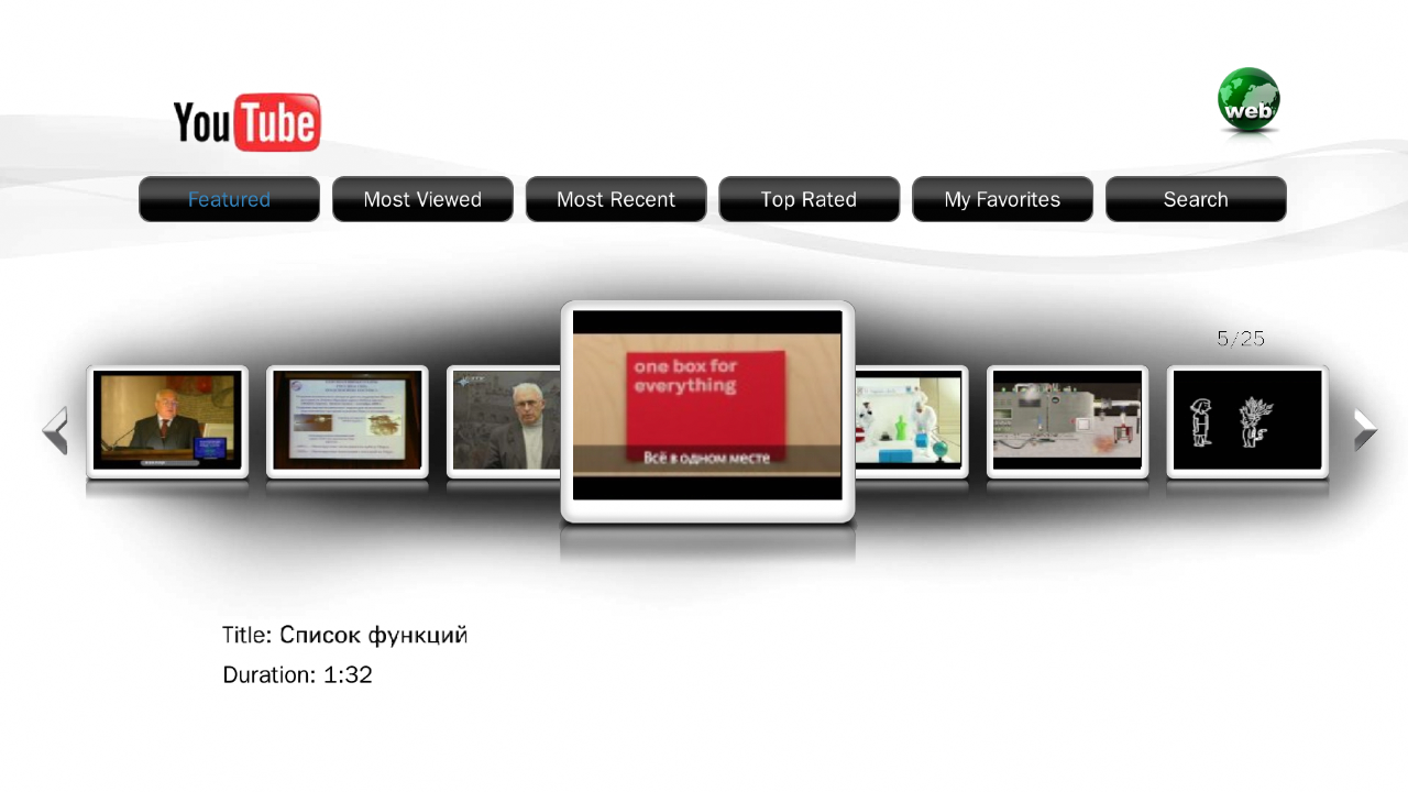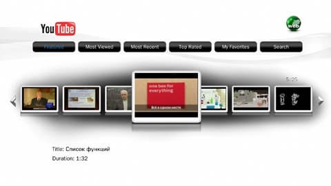 Плеер позволяет просматривать не только файлы, но и сетевые трансляции. В частности реализована поддержка сервиса YouTube. Можно выбирать категории и даты для отбора роликов. К сожалению, отображаются только видео стандартного разрешения, что на HD-панелях выглядит достаточно грустно.