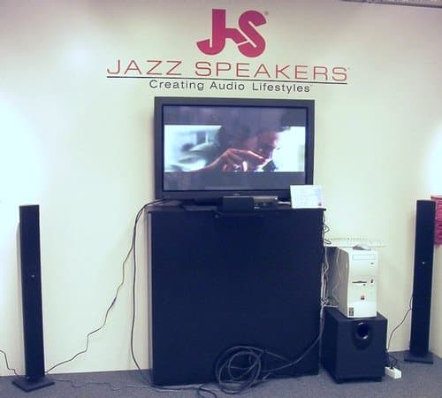 Переходим к колонкам JazzSpeakers. Здесь мы опять видим всю прошлогоднюю линейку моделей. Колонки любых расцветок и различных дизайнерских решений. В том числе из модного полупрозрачного пластика. Качество звучание здесь роли не играет. Главное, что звук вообще есть.