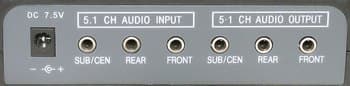 На передней панели расположены индикатор питания, регулятор общей громкости (по совместительству выключатель питания) и два выхода для подключения наушников. На задней стороне находятся шестиканальные выходы и входы и разъем для подключения питания. Выходы здесь реализованы сквозным образом, и блок можно использовать как переходник, не переключая каждый раз разъемы при использовании наушников.