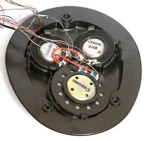 Как мы писали вначале, внутри наушника расположено по три динамика. Самый большой предназначен для воспроизведения фронтального сигнала, диаметр его мембраны составляет 4 сантиметра. Две оставшиеся аналогичные головки воспроизводят тыловой и центральные каналы, диаметр их мембран составляет 3 сантиметра. Как вы можете видеть на фотографии открытого наушника, для более точного разделения позиционирования у всех трех динамиков мембраны повернуты в разные стороны. Сигнал на сабвуфер в наушниках воспроизводит вибрирующая головка, находящаяся в неотделяемой части наушника.