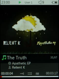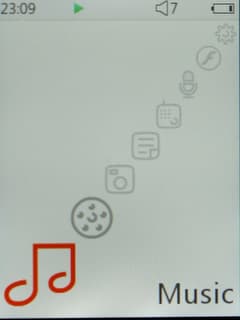 В плеере установлен ЖК-дисплей диагональю 2 дюйма, количество отображаемых цветов — 260000, разрешение 320 на 240 точек. При такой маленькой диагонали и QVGA разрешении картинка на экране очень четкая, изображение приятное. Плюс к этому — качественные шрифты и вообще оформление. Яркость настраивается в широких пределах, максимального ее значения как раз хватает, чтобы на улице не напрягать глаза.