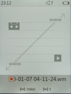 в формат MP3 с битрейтом от 32 до 256 Кбит/с. Настраивается также уровень записи. Качество записи очень хорошее, но присутствует фоновый "белый шум". Интерфейс диктофона весьма симпатичный и нетривиальный даже по сравнению с остальными функциями этого плеера. С одной стороны, это интересно, но с другой — выбивается из общей картины дизайна плеера.