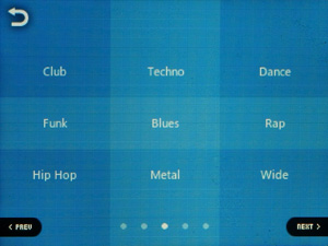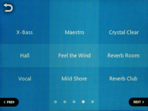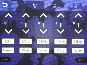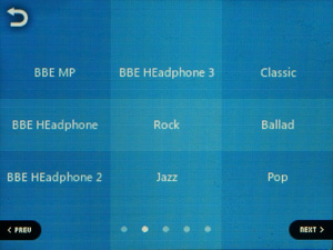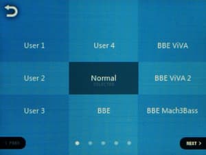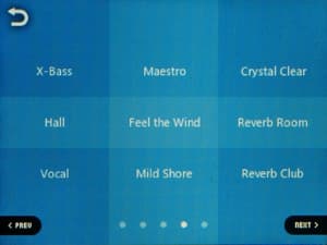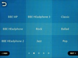 Эквалайзер традиционно представлен как возможностью выбора из огромного количества предустановок, так и возможностью создать 4 свои собственные пресета. В очень широких пределах позволяется регулировать АЧХ — можно вручную выбрать регулируемую частоту, полосу пропускания (из вариантов «нормальная», «широкая», «узкая»). Поверх обычных настроек можно наложить эффекты «улучшайзера» BBE+ и STE (Stereo Enhance).