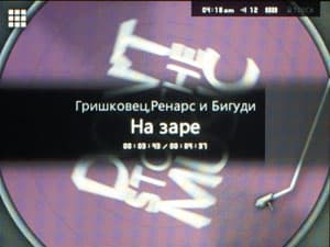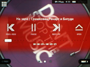 Экран воспроизведения представляет собой анимацию с вращающимся диском, обложкой которого служит обложка прослушиваемого вами трека. Если ее не имеется, отображается стандартная крутящаяся картинка. Эту анимацию, к сожалению, нельзя отключить. Поверх этого отображается белым цветом информация о треке — имя автора и название трека. Вверху — стандартный набор пиктограмм, информирующих о громкости, о заряде батареи, текущем времени.
