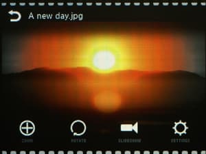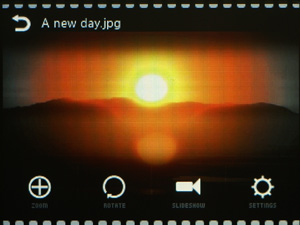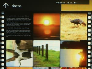 Поддерживается только формат JPEG. Картинки при просмотре можно вращать, увеличивать. Есть режим слайд-шоу.