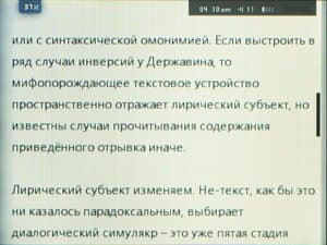 Поддерживается только один формат — TXT, русский текст нормально отображается в кодировках ANSI и Unicode. Из настроек и возможностей есть изменение размера шрифта, автопрокрутка текста, выбор темы оформления из предустановленных — цвет шрифта+цвет фона. Причем есть как «дневной» режим — черный текст на белом фоне, так и «ночной» — серый текст на черном фоне. Можно ставить закладки. Жаль, но текст не разворачивается на полный экран — вверху отображается всякая служебная информация. Прокручивать можно как скользя пальцем, так и поэкранно, нажимая на верхнюю или нижнюю часть экрана. Слова на конце строки не рвутся, а переносятся на следующую целиком. В целом, конечно, функциональность хуже, чем у программ-читалок на смартфонах, но в крайнем случае можно почитать и с плеера.