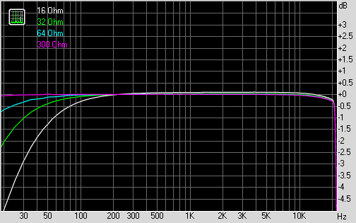 Кроме того, мы провели измерения, подключив реальные наушники. Были использованы следующие модели: Sennheiser HD600 (300 Ом), арматурные Philips SHE-9850 (12 Ом), арматурные Creative Aurvana In-Ear2 (42 Ом).