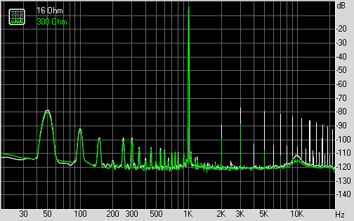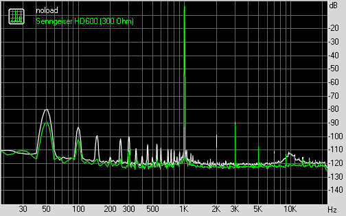 График гармонических искажений при подключении без нагрузки и под нагрузкой наушниками Sennheiser HD600 (300 Ом):