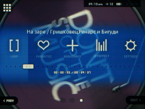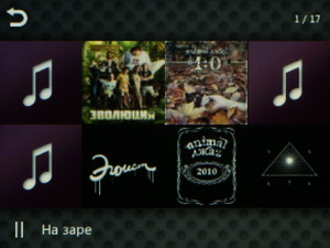 Нажатие на экран вызывает панель с кнопками, а также прогресс-бар: нажав в любом его месте, можно сразу оказаться в соответствующем месте трека. Кнопки такие: Play/Pause, для переключения треков вперед/назад, а также кнопка для открытия музыки. И вот здесь начинается самое интересное. Нажав сначала на экран, затем на эту всплывающую кнопку открытия музыки, вы попадаете в список песен, открытый вами последним. Но чтобы переместиться наверх по иерархии файлов, необходимо нажать в правом верхнем углу небольшую пиктограмму с изображением облачка-диалога (что уже довольно странно). Затем внизу отобразится кнопка «Вверх», только нажав которую, вы сможете открыть остальную библиотеку музыки. Иначе говоря, необходимо нажать 3 раза в разных местах дисплея, что не логично. При этом левый верхний угол при воспроизведении занимает пиктограмма браузера музыки, основанного на отображении обложек альбомов.
