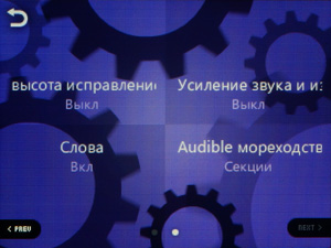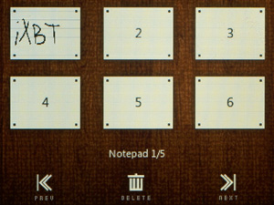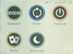 Здесь стоит упомянуть об изменениях в интерфейсе. Если ранее под палец было «заточено» только главное меню, которое было представлено традиционными квадратными иконками, то теперь это многооконное меню, пролистываемое пальцем. В одном окне — музыка, видео, радио, картинки и текстовый просмотрщик, в другом — браузер файлов, флеш-плеер, диктофон, вызов настроек, в третьем — разные бонусные функции, представленные в данной модели секундомером, калькулятором, записными книжками — одна рукописная, другая — с виртуальной QWERTY-клавиатурой. И на последнем, четвертом экране можно быстро сменить ориентацию дисплея, яркость (от 1 до 10), тему оформления (их всего две), отправить плеер в спящий режим (это можно сделать и механической кнопкой). Помимо главного экрана, на управление пальцем стали ориентированы и все остальные функции плеера.
