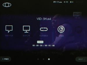 Несмотря на маленький экран и вторичность функции просмотра видео, настроек у нее очень много. Изменяемо соотношение сторон проигрываемого ролика. Можно выбрать режим воспроизведения — повтор всех, играть только одну папку или все файлы из памяти, зациклить файл. Сложно сказать, зачем столько разных режимов, но они есть, и, быть может, кому-то пригодятся. Регулируется скорость воспроизведения — можно быстрее просмотреть какой-либо очередной сериал. На видео можно ставить закладки, зацикливать какой-либо участок и даже накладывать на звуковую дорожку эффекты эквалайзера. Поддерживаются и субтитры — форматов SMI, SRT. Для них можно настроить размер шрифта, положение на экране, цвет.