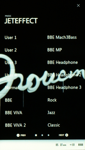 Как и в уже не раз упомянутых J3 и S9, меню плеера построено на виджетах и иконках программ, которые можно как угодно размещать на трех экранах. Экраны пролистываются движением пальца. В общем, все довольно-таки привычно для современных устройств с сенсорным экраном.